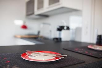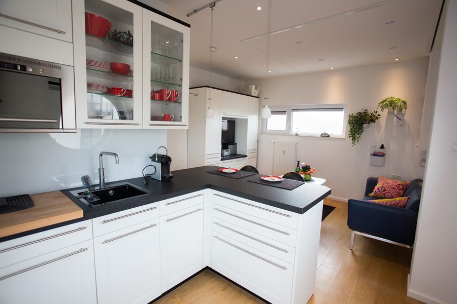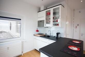 Die Küche ist hell und offen zum Wohnraum, beim Kaffeekochen kann man aufs Meer sehen. Die Ausstattung umfasst einen 2-Platten-Induktionsherd, Mikrowellenofen, Geschirrspülmaschine, Eierkocher, Kühlschrank, Kaffeemaschine und Nespresso-Maschine (nicht alle Kapselsorten vorrätig).