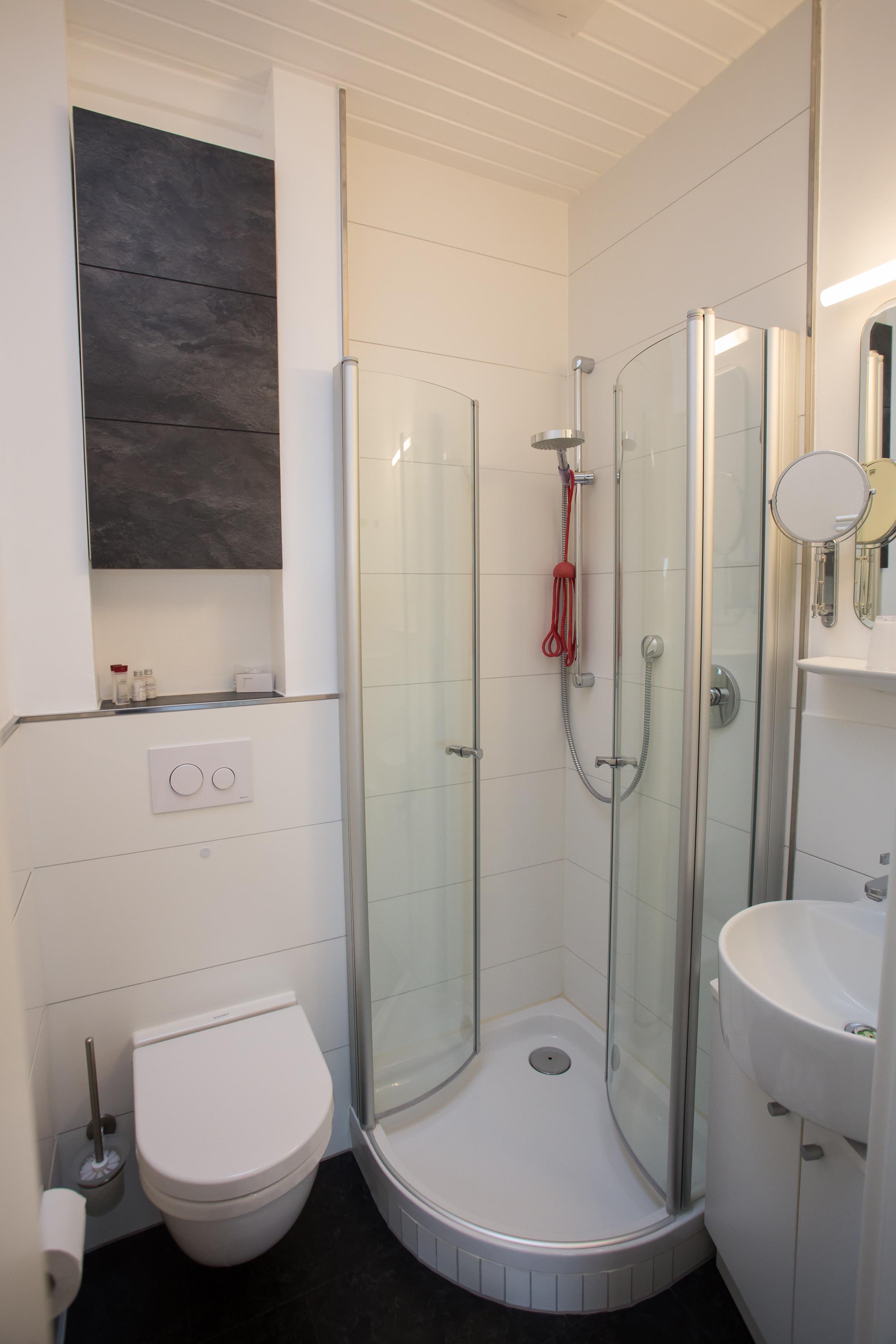 Im Dusch-Bad befindet sich ein Wasch/Trockner-Kombigerät, ein beleuchteter Schminkspiegel mit Vergrößerung, ein Fön und ein Handtuchtrockner.