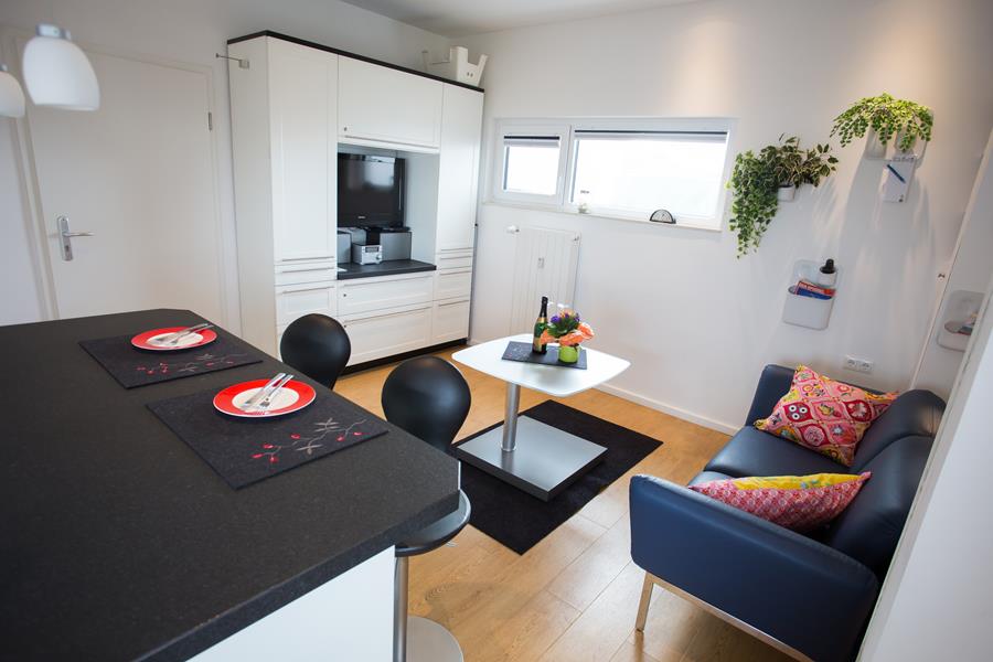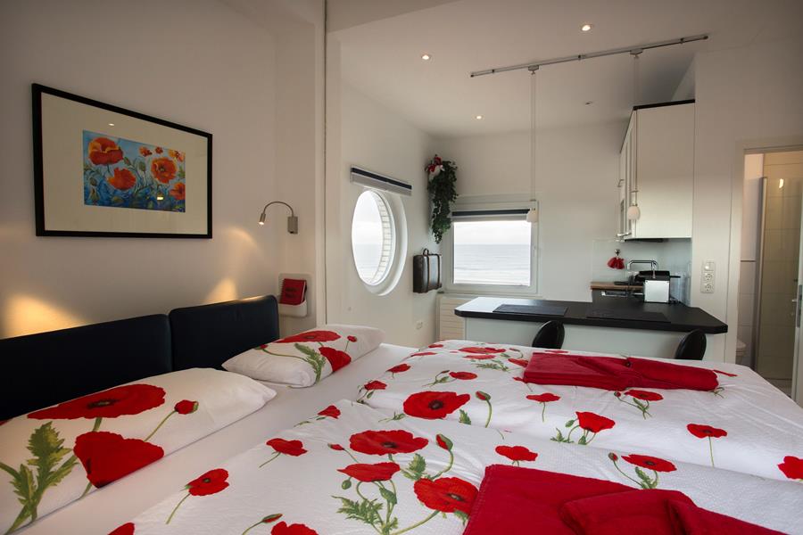 Vom Wohnzimmer hat man einen Blick über Strand und Meer in nördlicher und westlicher Richtung sowie nach Süden zum Festland. Der Raum ist ausgestattet mit einem Sofa für zwei Personen, mit Kabel-TV und DVD, auch Internet und W-Lan stehen zur Verfügung.