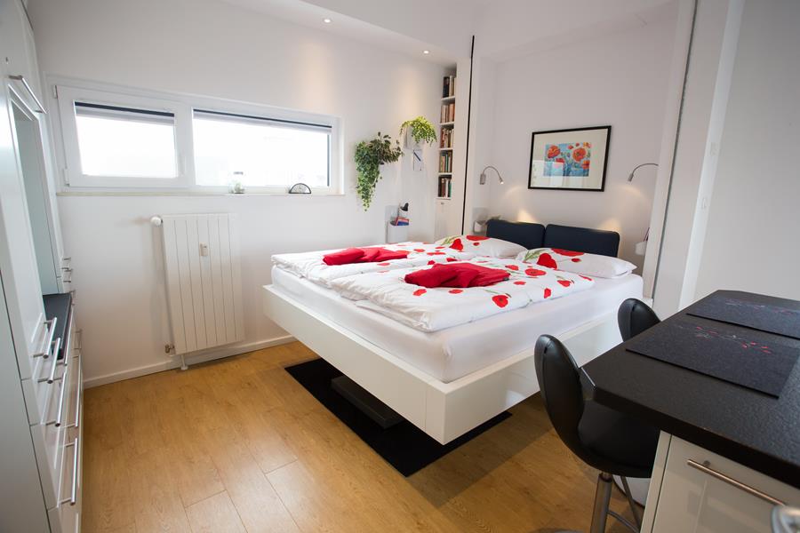 Das Bett wird motorbetrieben in der Raumdecke versenkt und ist deswegen tagsüber nicht im Wege. Die Schlafposition ist individuell wählbar, sodass man sich noch beim Einschlafen die auf Reede liegenden Schiffe ansehen kann, wenn man möchte. Das Südenster ist mit Insektenschutz ausgestattet.