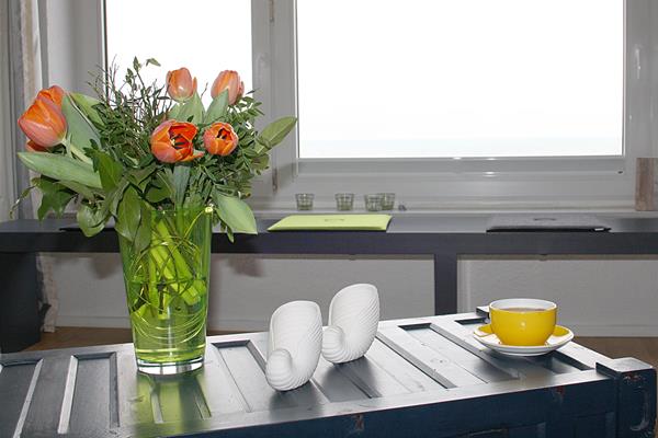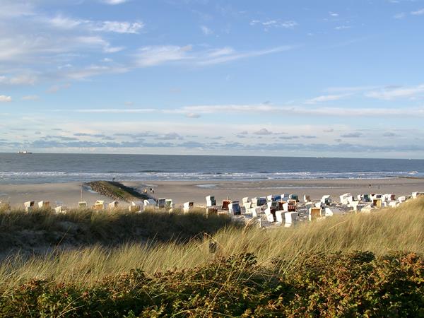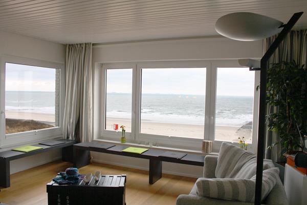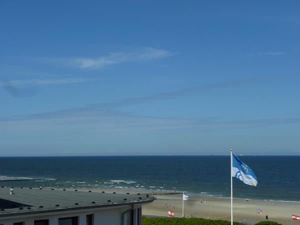 Vom Wohnzimmer hat man einen Panoramablick über Strand und Meer in nördlicher und westlicher Richtung. Ein Stativ-Fernglas zum Beobachten der Schiffe ist vorhanden.