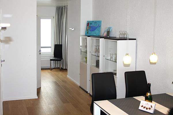Der Essplatz kann mit einem ausziehbaren Esstisch von bis zu 10 Personen genutzt werden.